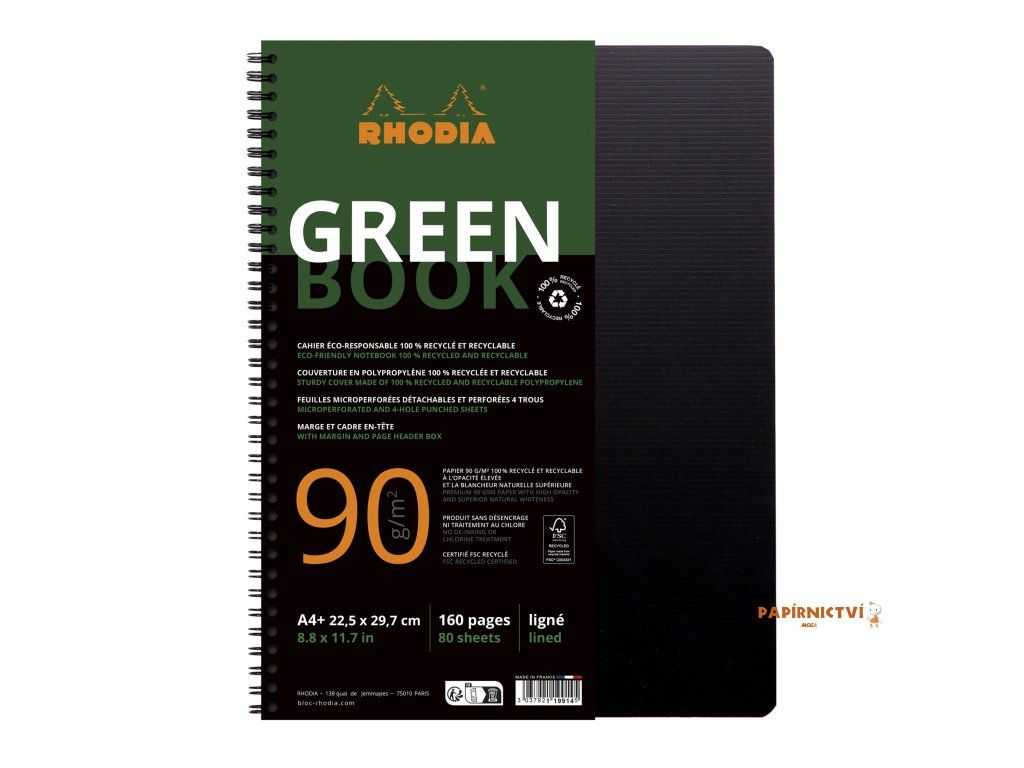 Rhodia Greenbook, A4+, 80 listů, linky, s děrováním, černý