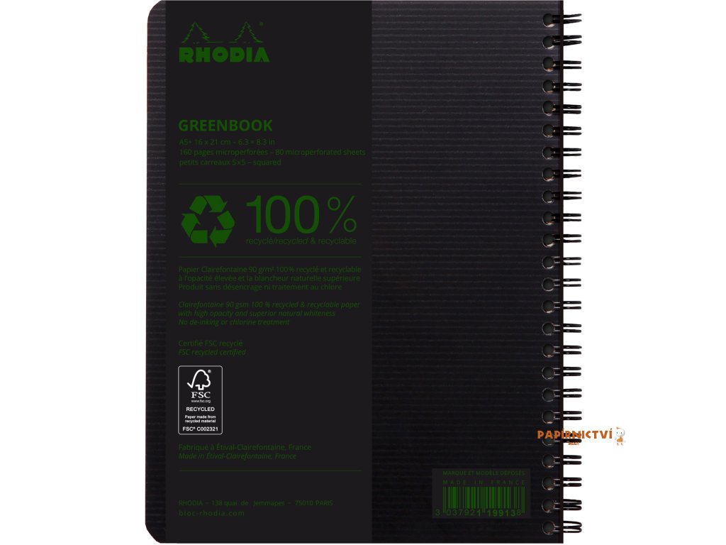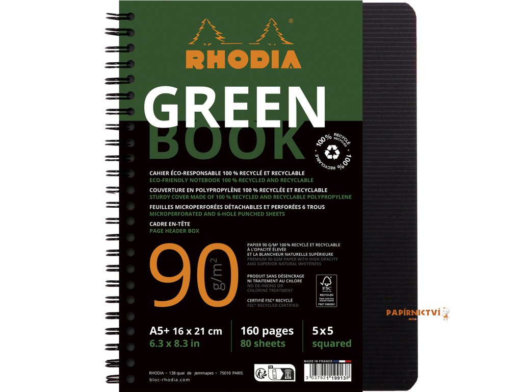 Rhodia Greenbook, A5+, 80 listů, čtvereček 5x5, s děrováním, černý