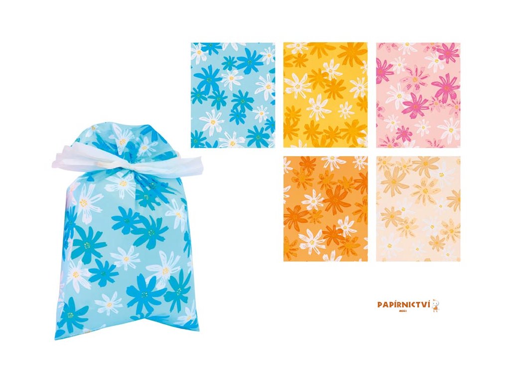 Dárkový sáček v mixu matných barev s dvoubarevným potiskem květů. Sáček je vyrobený z pevného a kvalitního materiálu. Skvělý na zabalení drobných dárků. Sáček můžete uzavřít vázací stuhou a tím ho dozdobit. V naší nabídce naleznete velký výběr stužek a rozetek, které Vám pomohou při dekoraci balíčku.Motiv: květy