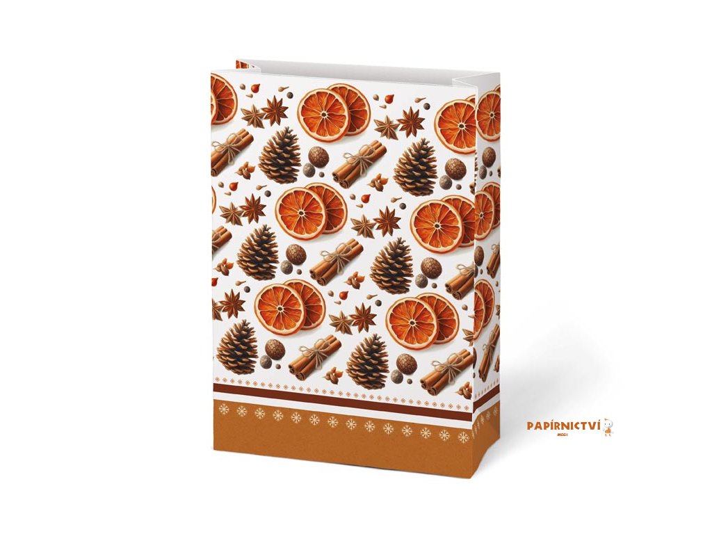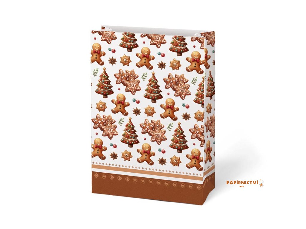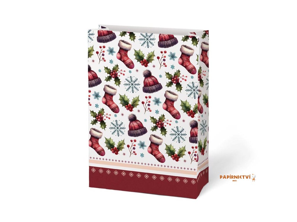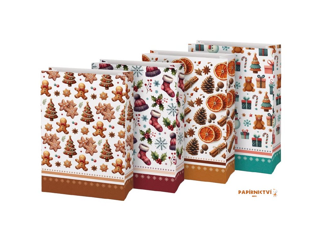 Dárkový sáček v mixu vánočních motivů. Každý motiv je detailně zpracován s důrazem na tradiční vánoční prvky. Sáček je vyroben z pevného kraftového papíru. Tento elegantní dárkový sáček je ideální volbou pro prezentaci vašich vánočních dárků, které získají nádech luxusu. Ideální pro balení menších dárků, sladkostí nebo drobných pozorností. Tento sáček kombinuje praktické využití s krásným designem, což z něj činí ideální volbu pro každého, kdo chce své dárky zabalit rychle, ale přitom vkusně.Balení: 12 ks