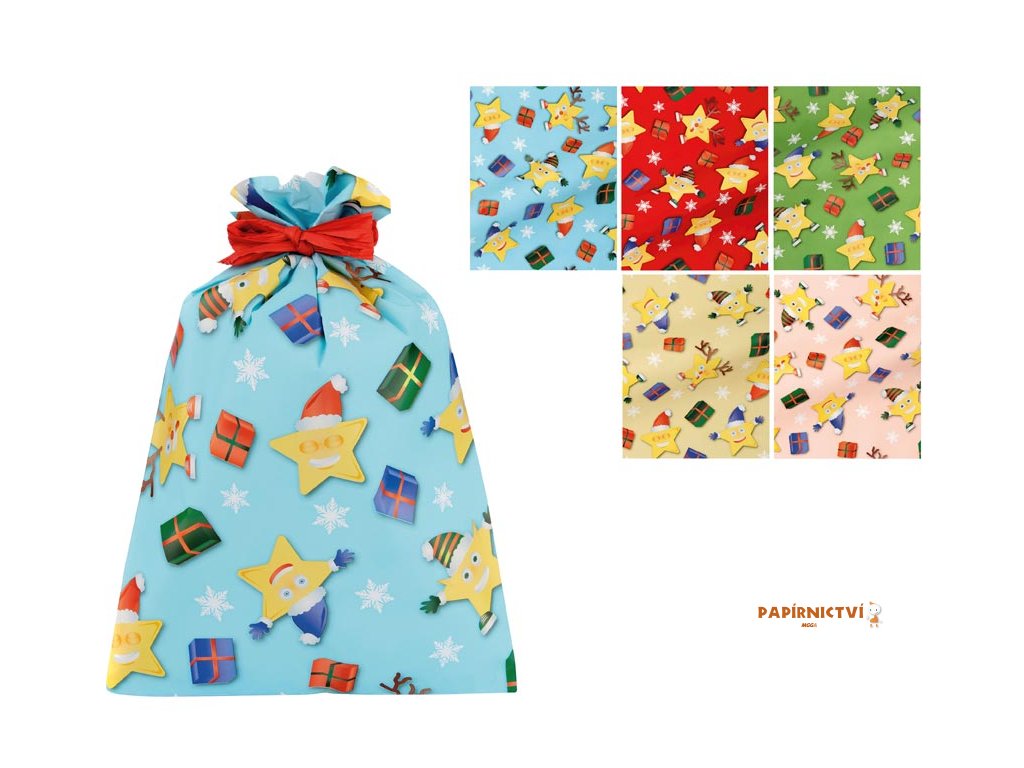 Vánoční dárkový sáček, vyrobený z lesklého materiálu s veselým a hravým vánočním potiskem. Umožňuje snadno zabalit různé druhy drobných dárků bez nutnosti použití balicího papíru. Praktický a elegantní způsob balení, který šetří čas i námahu. Sáček můžete uzavřít vázací stuhou a tím ho dozdobit.Materiál: polypropylen