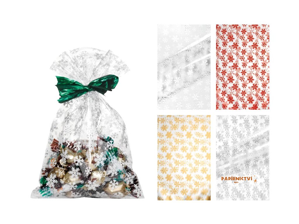 Vánoční průhledný dárkový sáček s motivem vloček v bílé, červené, zlaté nebo stříbrné barvě. Vyrobený z luxusního celofánu s potiskem. Skvělý na zabalení drobných dárků. Sáček můžete uzavřít vázací stuhou a tím ho dozdobit.Motiv: vločky