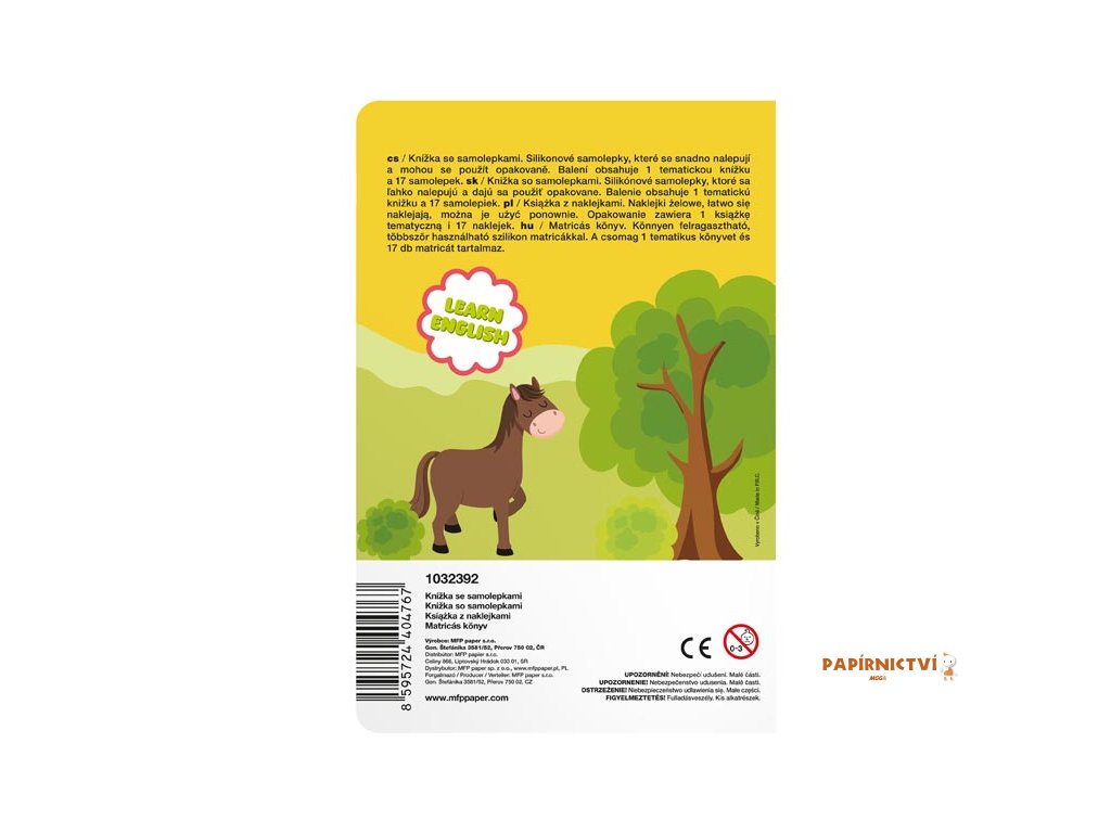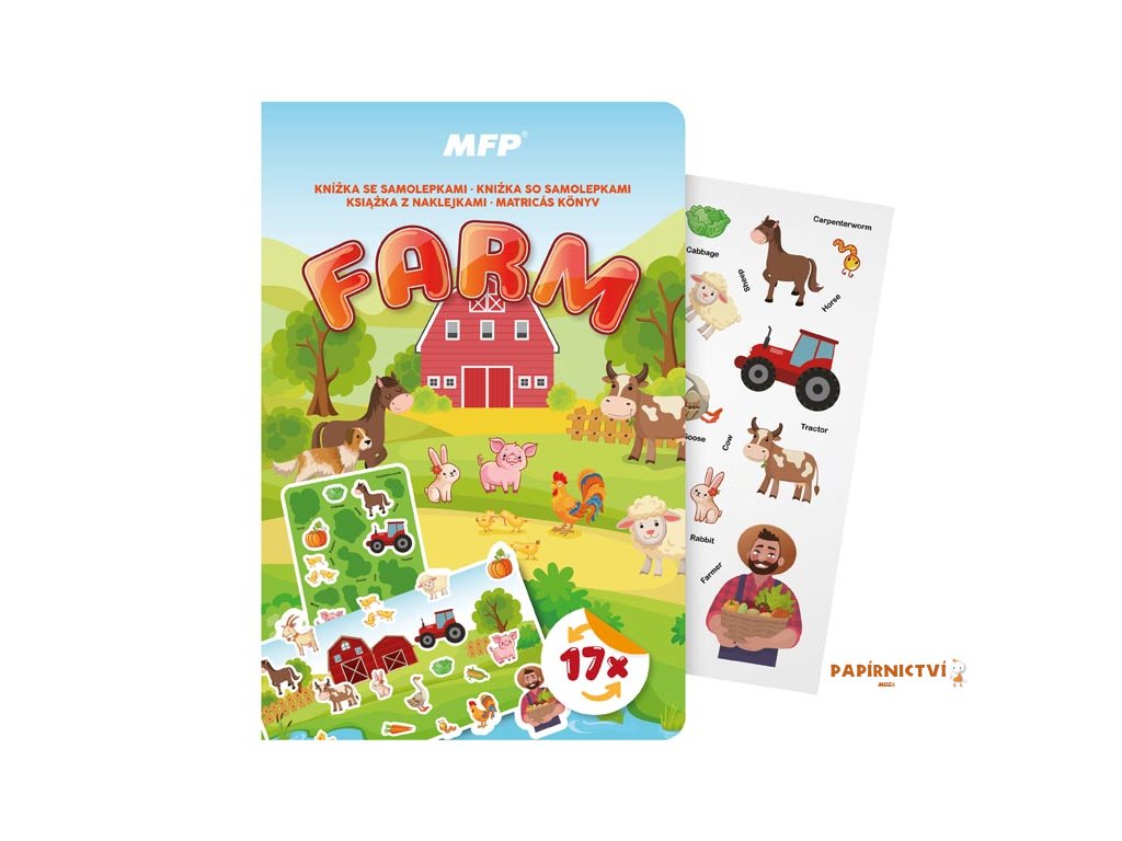Obsahuje 17 znovupoužitelných samolepek s rozkošnými motivy – od veselého prasátka, majestátního koně a pilného farmáře, až po chutné plodiny jako mrkev či dýně a samozřejmě traktor, který vše rozhýbe!