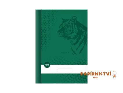 Školní sešit ve formátu A4, čtverečkovaný, v tmavě zelené barvě, s motivem tygra, v deskách z křídového papíru. Oproti běžným čtverečkovaným sešitům je rozměr čtverečků dvakrát...