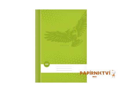 Školní linkovaný sešitu ve formátu A4, v zelené barvě, s motivem sovy, v deskách z křídového papíru.