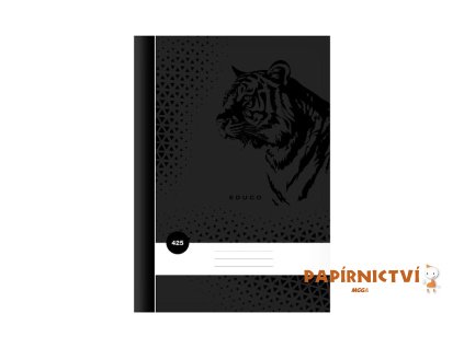 Školní sešit ve formátu A4, čtverečkovaný, v černé barvě, s motivem tygra, v deskách z křídového papíru.