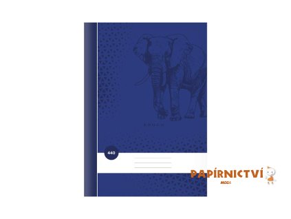 Školní sešit čistý, bez linek ve formátu A4, v tmavě modré barvě, s motivem slona, v deskách z křídového papíru.