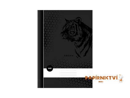 Školní sešit ve formátu A4, čtverečkovaný, v černé barvě, s motivem tygra, v deskách z křídového papíru.