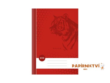 Školní sešit ve formátu A5, čtverečkovaný, v červené barvě, s motivem tygra, v deskách z křídového papíru. Oproti běžným čtverečkovaným sešitům je rozměr čtverečků dvakrát větší.