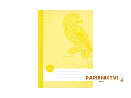 Školní linkovaný sešit ve formátu A5, ve žluté barvě, s motivem papouška, v deskách z křídového papíru. Stránky jsou bez okrajů.