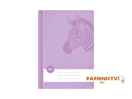 Školní linkovaný sešit ve formátu A5, ve fialové barvě, s motivem zebry, v deskách z křídového papíru. Stránky jsou bez okrajů.