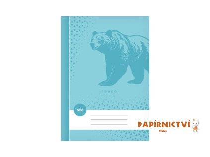 Školní linkovaný sešit ve formátu A5, ve tyrkysové barvě, s motivem medvěda, v deskách z křídového papíru. Stránky jsou bez okrajů.