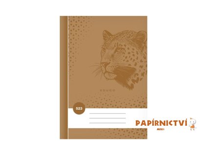 Školní linkovaný sešit ve formátu A5, v hnědé, s motivem leoparda, v deskách z křídového papíru. Stránky jsou bez okrajů.