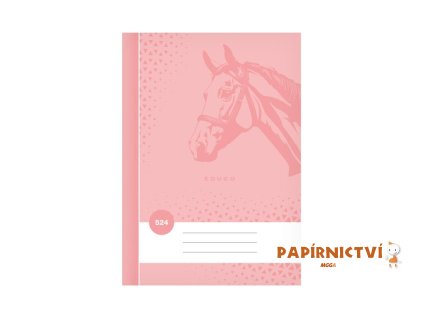 Školní linkovaný sešit ve formátu A5, v růžové barvě, s motivem koně, v deskách z křídového papíru. Stránky jsou opatřeny okraji o šířce 2 cm.