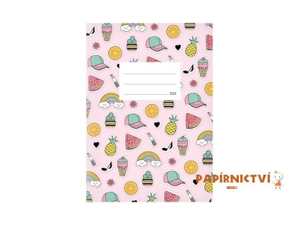Školní linkovaný sešit ve formátu A5, v růžové barvě, s dívčími motivy, v originálních deskách s matným laminem a lokálním UV lakem. Stránky jsou bez okrajů.