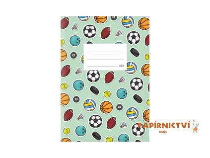 Školní sešit s linkou ve formátu A5, v zelené barvě, se sportovními motivy, v originálních deskách s matným laminem a lokálním UV lakem. Stránky jsou bez okrajů.