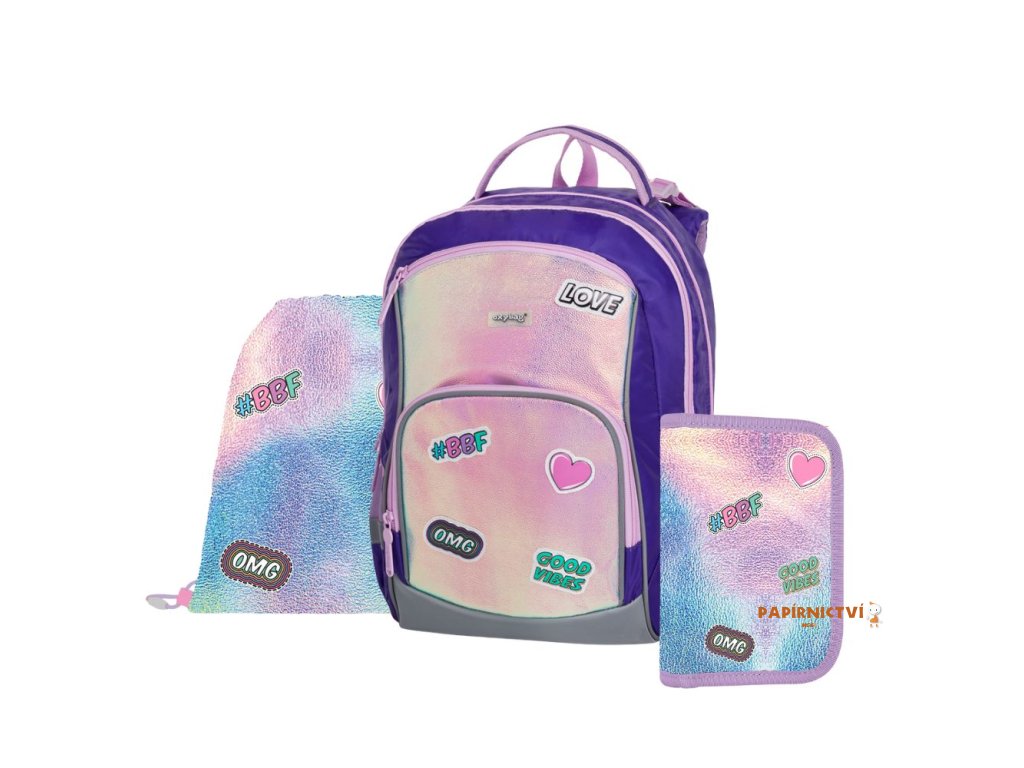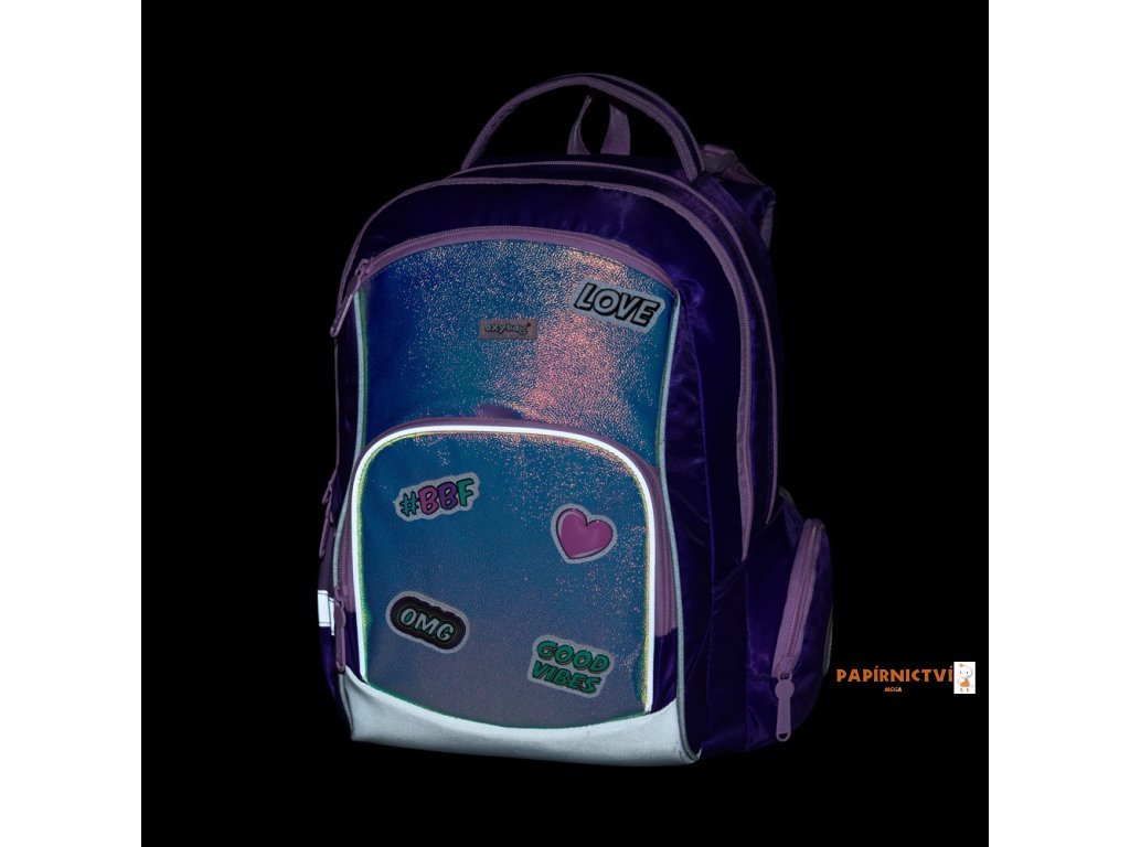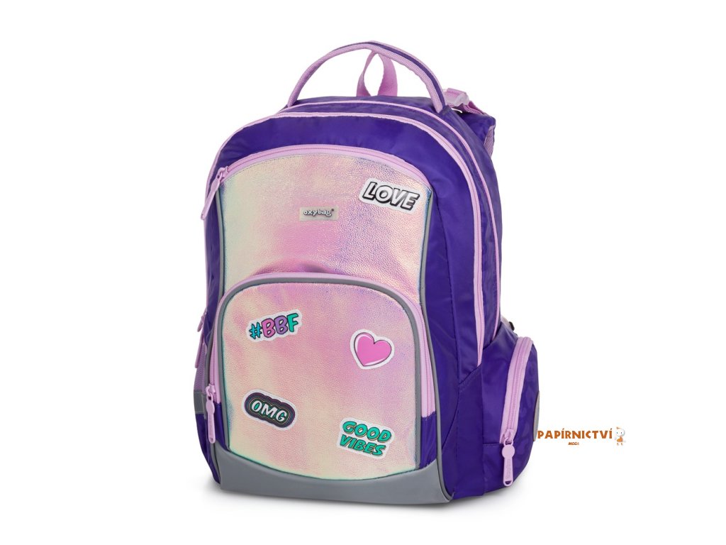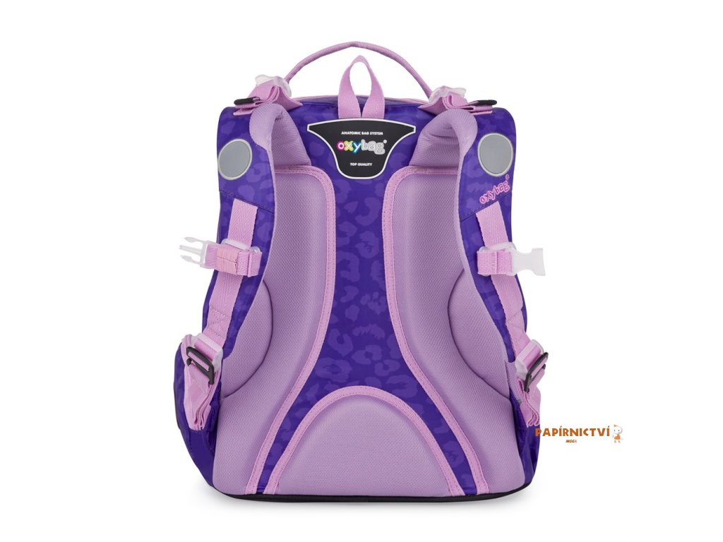 Školní batoh OXY GO zaujme moderním designem a promyšlenou funkčností. Má anatomicky tvarovaná, prodyšná záda a nastavitelné ramenní popruhy pro pohodlné nošení. Přidané háčky umožňují uchycení dlouhých popruhů. Vnitřní kapsy nabízí dostatek místa na učebnice, sešity i další potřeby, pevné nepromokavé dno chrání obsah před ušpiněním a protečením. Boční kapsy, jedna na zip a jedna otevřená, slouží např. na láhev. Reflexní prvky zajišťují bezpečnost. Batoh je ideální pro děti od 1. do 3. třídy vysoké od 125 cm. Délka zádového panelu je 39 cm, objem 22 l, hmotnost 930 g, nosnost 8 kg. Sáček: Praktický na cvičky nebo volnočasové aktivity, uzavírá se šňůrkami. Penál: Jednopatrový se dvěma chlopněmi, poutka na psací potřeby a průhledná fólie na rozvrh hodin.