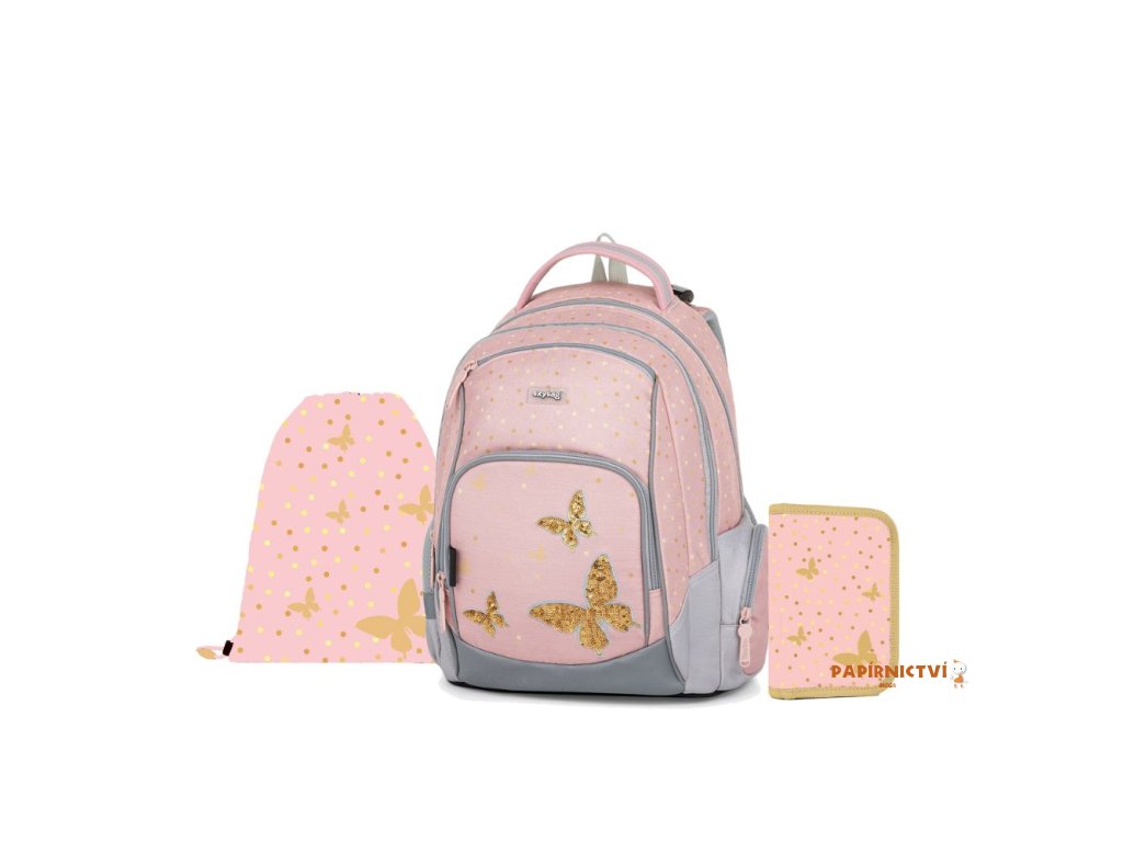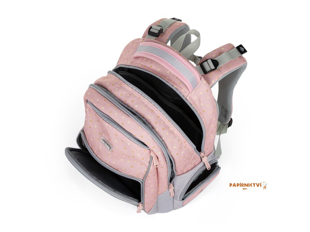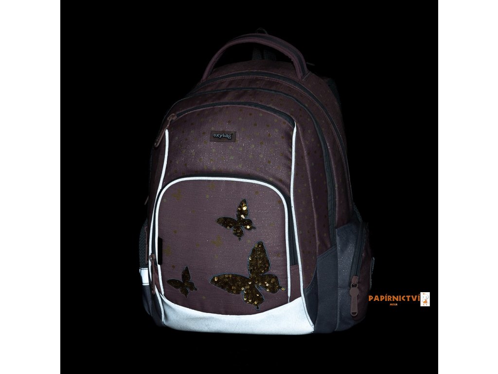 Školní batoh OXY GO zaujme moderním designem a promyšlenou funkčností. Má anatomicky tvarovaná, prodyšná záda a nastavitelné ramenní popruhy pro pohodlné nošení. Přidané háčky umožňují uchycení dlouhých popruhů. Vnitřní kapsy nabízí dostatek místa na učebnice, sešity i další potřeby, pevné nepromokavé dno chrání obsah před ušpiněním a protečením. Boční kapsy, jedna na zip a jedna otevřená, slouží např. na láhev. Reflexní prvky zajišťují bezpečnost. Batoh je ideální pro děti od 1. do 3. třídy vysoké od 125 cm. Délka zádového panelu je 39 cm, objem 22 l, hmotnost 930 g, nosnost 8 kg. Sáček: Praktický na cvičky nebo volnočasové aktivity, uzavírá se šňůrkami. Penál: Jednopatrový se dvěma chlopněmi, poutka na psací potřeby a průhledná fólie na rozvrh hodin.