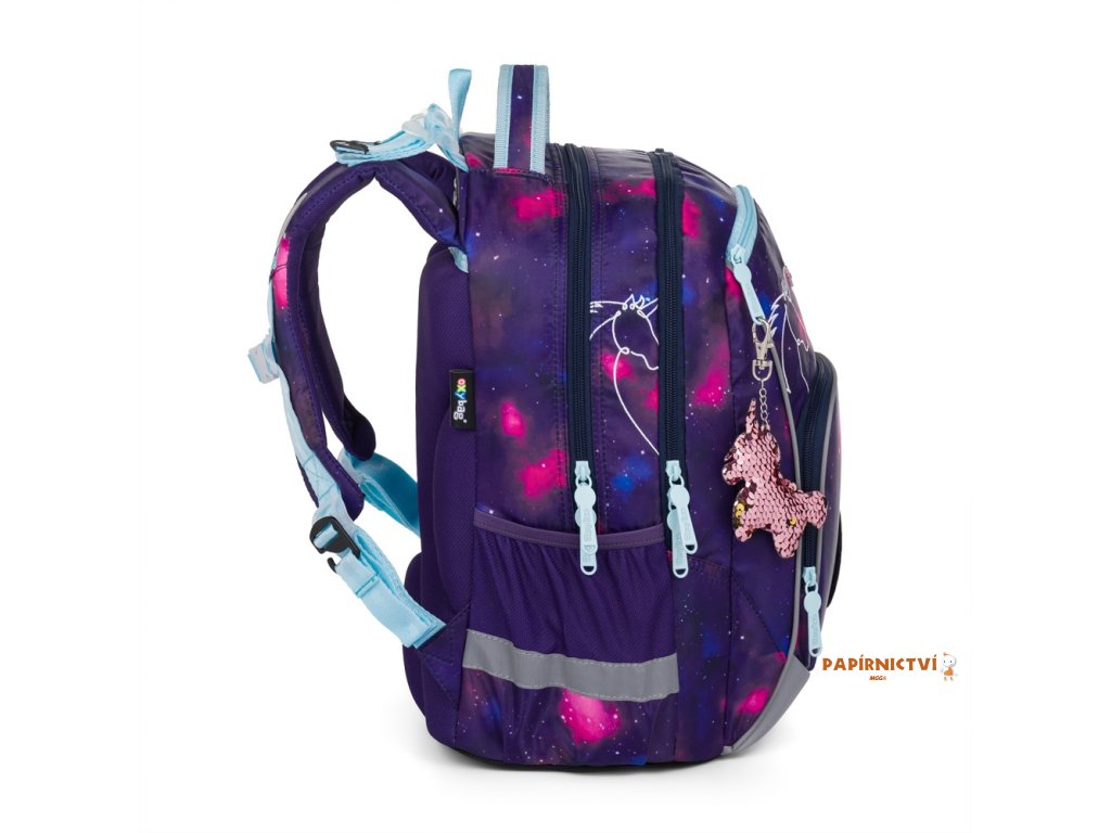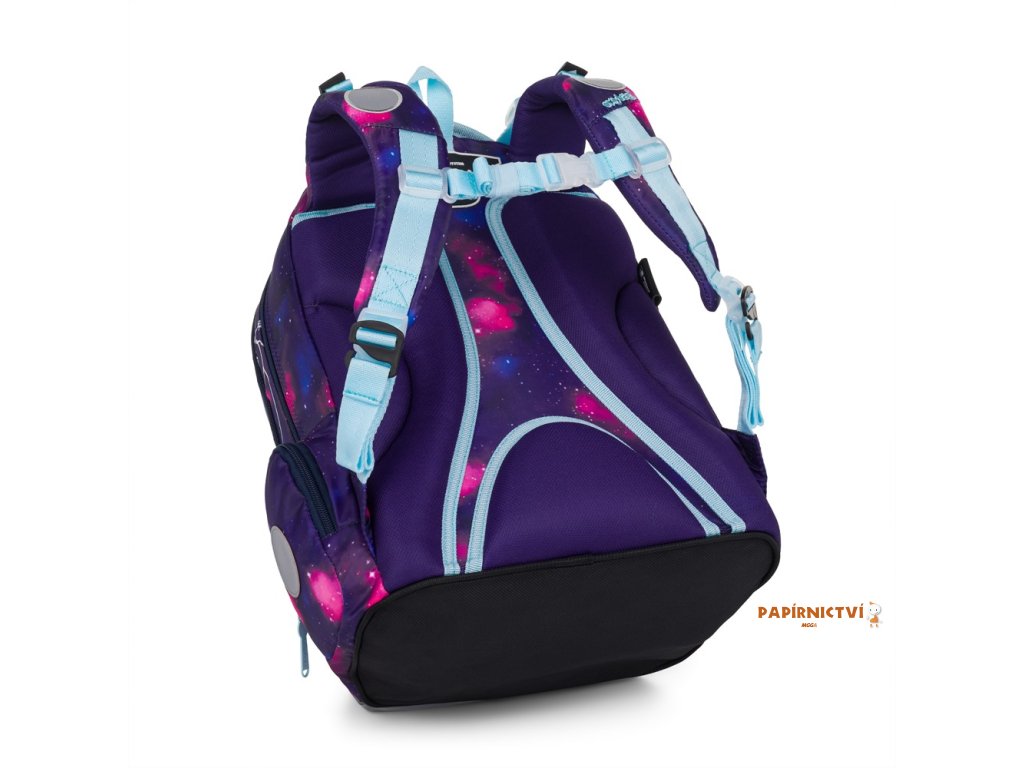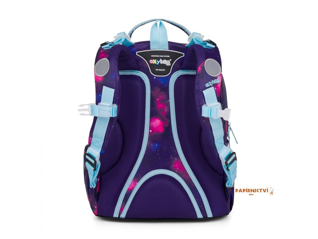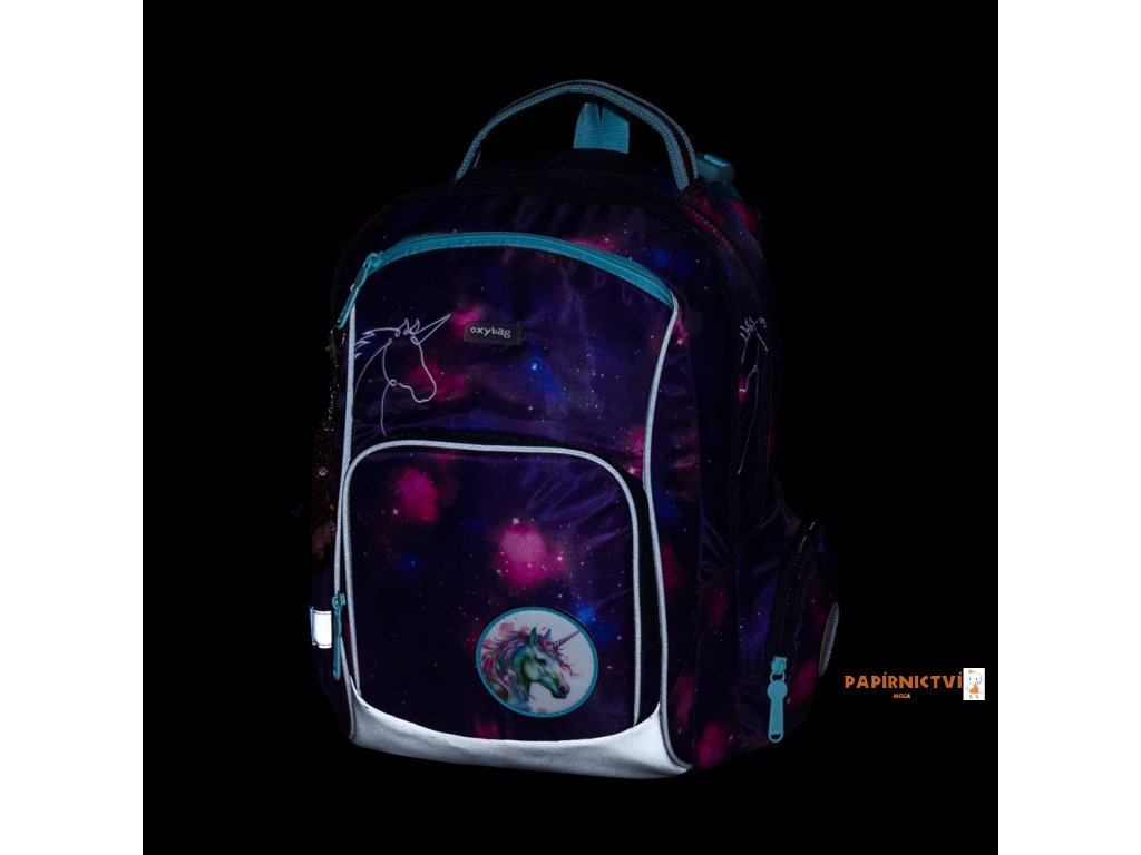 Školní batoh OXY GO zaujme moderním designem a promyšlenou funkčností. Má anatomicky tvarovaná, prodyšná záda a nastavitelné ramenní popruhy pro pohodlné nošení. Přidané háčky umožňují uchycení dlouhých popruhů. Vnitřní kapsy nabízí dostatek místa na učebnice, sešity i další potřeby, pevné nepromokavé dno chrání obsah před ušpiněním a protečením. Boční kapsy, jedna na zip a jedna otevřená, slouží např. na láhev. Reflexní prvky zajišťují bezpečnost. Batoh je ideální pro děti od 1. do 3. třídy vysoké od 125 cm. Délka zádového panelu je 39 cm, objem 22 l, hmotnost 930 g, nosnost 8 kg. Sáček: Praktický na cvičky nebo volnočasové aktivity, uzavírá se šňůrkami. Penál: Jednopatrový se dvěma chlopněmi, poutka na psací potřeby a průhledná fólie na rozvrh hodin.