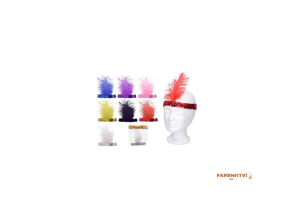 Karnevalová čelenka s peřím se skvěle hodí ke kostýmu z 30. let, kdy se tento doplněk hojně používal. Je elastická, přizpůsobí se každému. Díky flitrům se působivě leskne a celkově působí velmi elegantně.