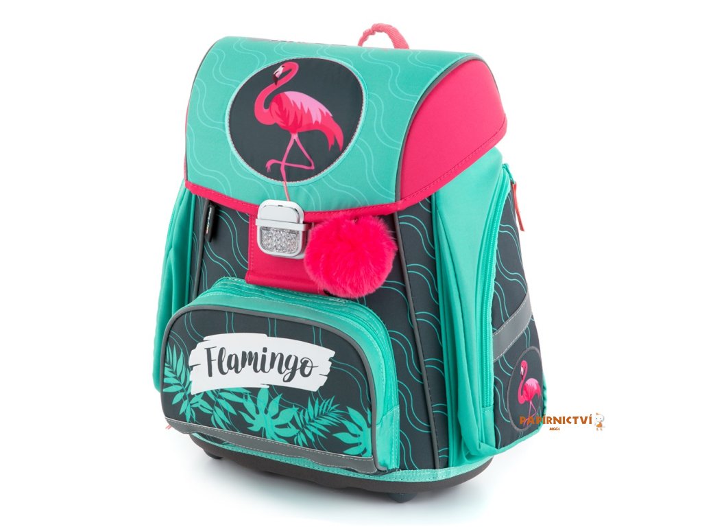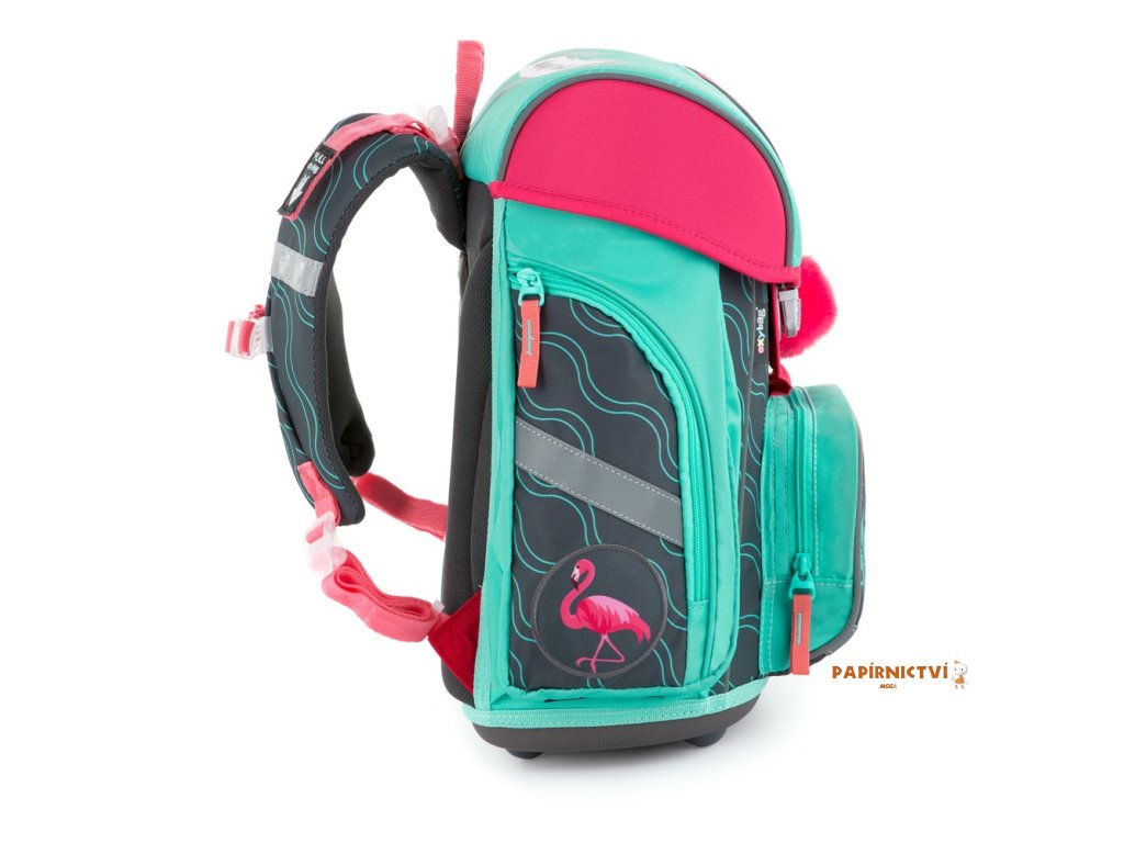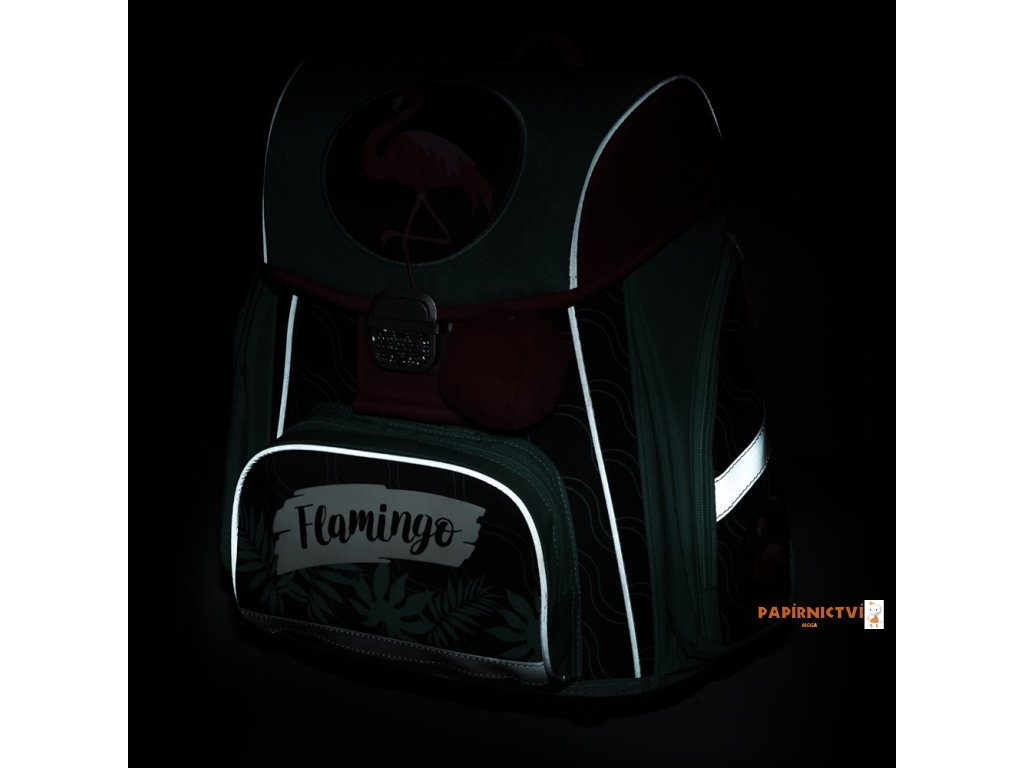 Školní aktovka z řady Premium s motivem plameňáka je anatomicky tvarovaná a zajišťuje tak správné usazení na zádech. Vyztužená záda a vnitřní výztuha udržují stálý tvar batohu. Polstrování je z příjemného prodyšného materiálu, široké měkčené popruhy jsou navrženy tak, aby dokonale přilnuly a rovnoměrně zatížily ramena dítěte. Aktovka se skládá z jedné prostorné komory, kam se pohodlně vejdou všechny školní pomůcky pro děti v 1. a ve 2. třídě. Dno batohu je z pevného materiálu, chrání tím obsah před převržením a vysypáním. Zapínání je na bezpečnostní přezku. Přední kapsička je určena na svačinu, nechybí řada reflexních prvků, díky kterým je aktovka viditelnější.