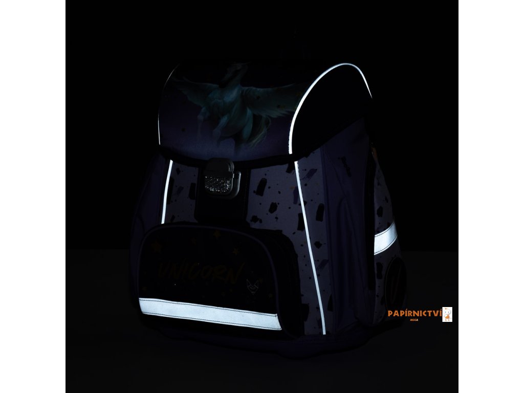 Školní aktovka z řady Premium s motivem pegase je anatomicky tvarovaná a zajišťuje tak správné usazení na zádech. Vyztužená záda a vnitřní výztuha udržují stálý tvar batohu. Polstrování je z příjemného prodyšného materiálu, široké měkčené popruhy jsou navrženy tak, aby dokonale přilnuly a rovnoměrně zatížily ramena dítěte. Aktovka se skládá z jedné prostorné komory, kam se pohodlně vejdou všechny školní pomůcky pro děti v 1. a ve 2. třídě. Dno batohu je z pevného materiálu, chrání tím obsah před převržením a vysypáním. Zapínání je na bezpečnostní přezku. Přední kapsička je určena na svačinu, nechybí řada reflexních prvků, díky kterým je aktovka viditelnější.