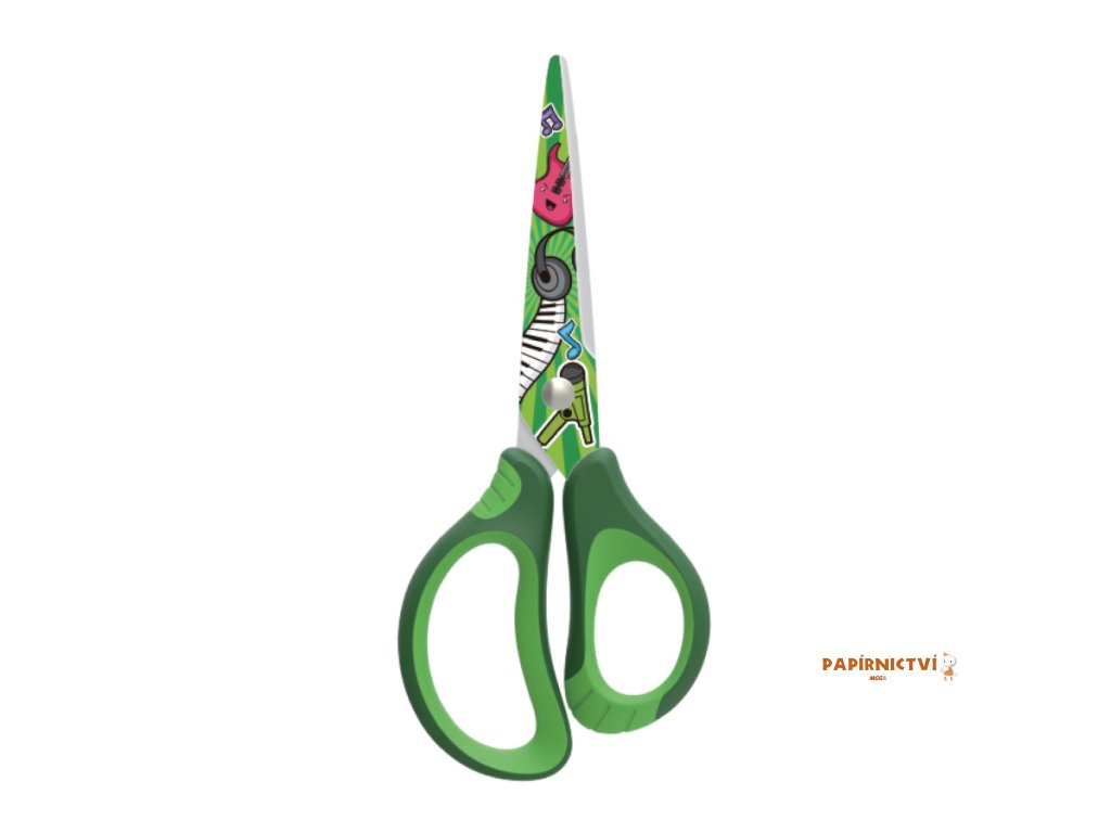 Školní nužky s potiskem a s kulatou špickou 15cm. Ergonomická a mekká rukojet pro snadnejší držení. Kvalitní ocelové nože. Moderní "tattoo" design. Dodáváno v zelené barve.Doplňkové parametry