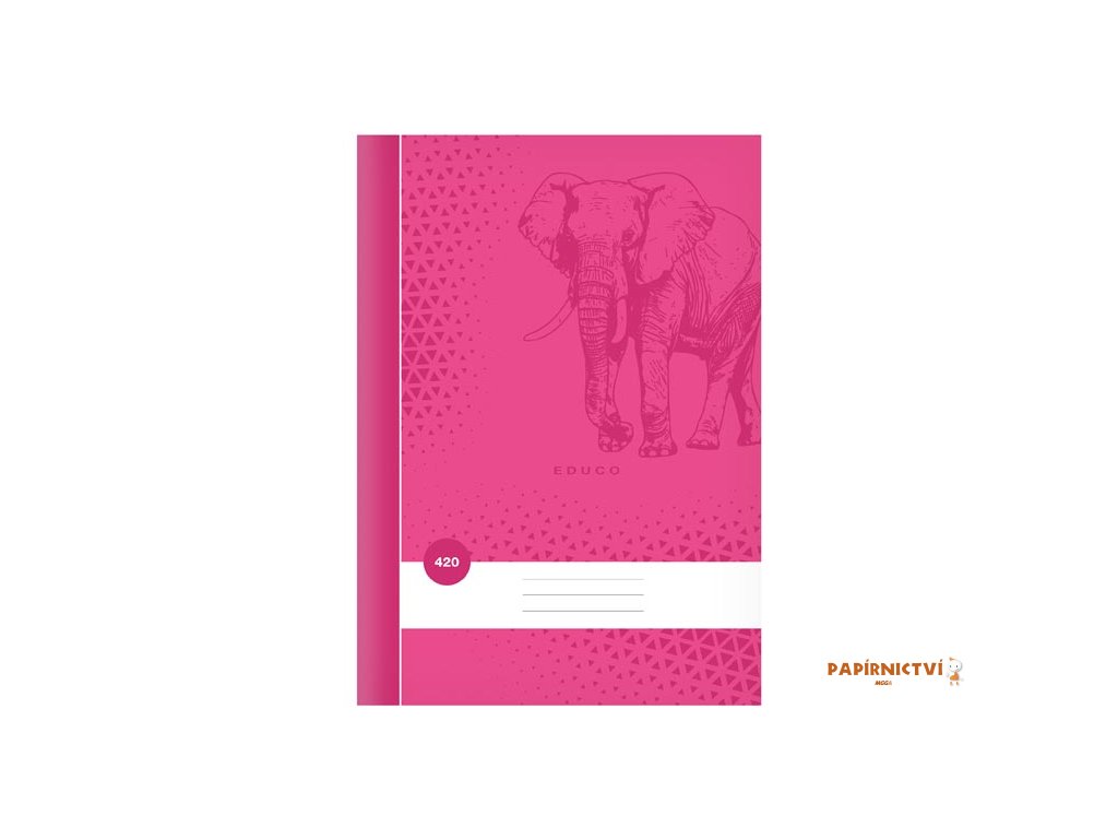 Školní sešit čistý, bez linek ve formátu A4, v malinové barvě, s motivem slona, v deskách z křídového papíru.Typ: 420