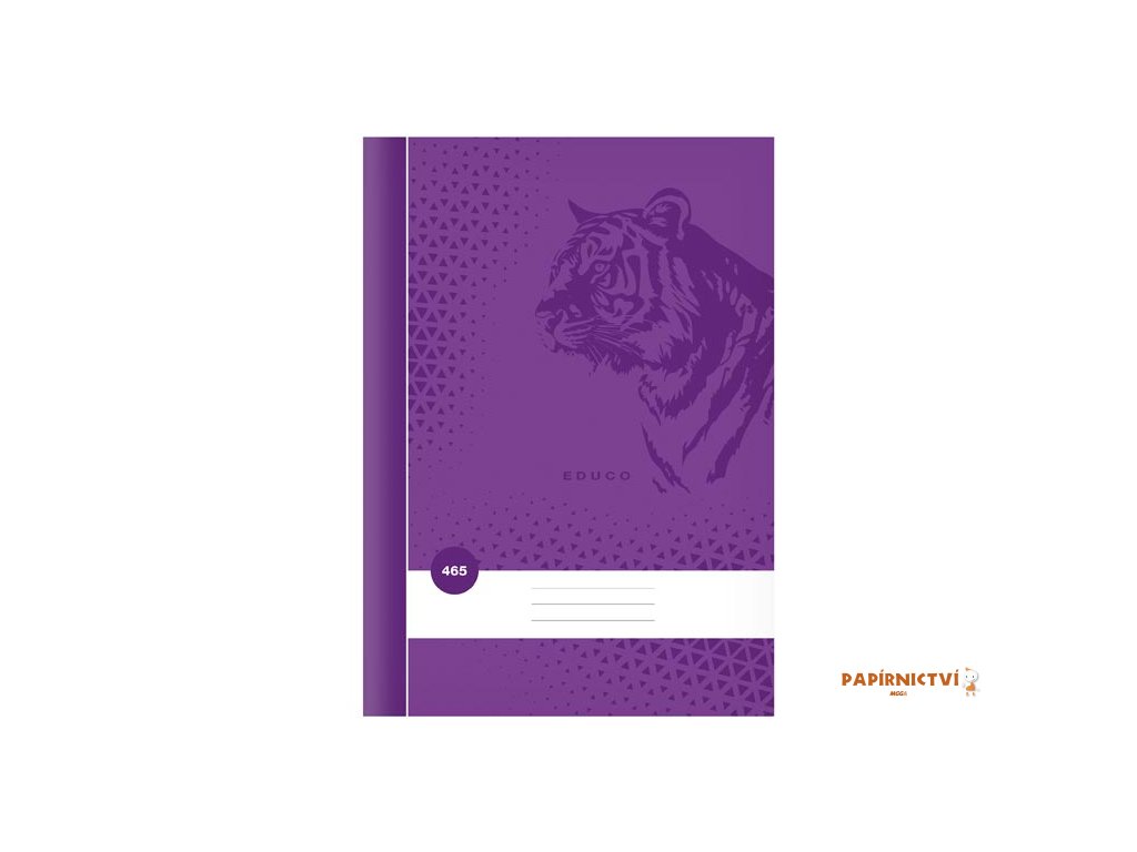 Školní sešit ve formátu A4, čtverečkovaný, v tmavě fialové barvě, s motivem tygra, v deskách z křídového papíru.Typ: 465