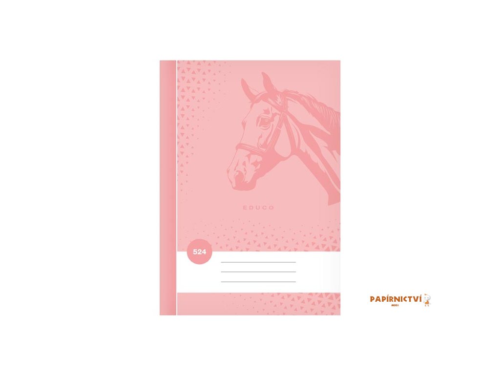 Školní linkovaný sešit ve formátu A5, v růžové barvě, s motivem koně, v deskách z křídového papíru. Stránky jsou opatřeny okraji o šířce 2 cm.Typ: 524