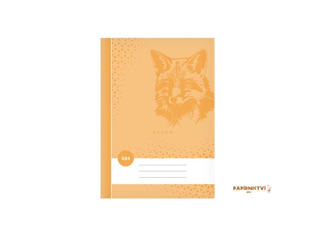 Školní linkovaný sešit ve formátu A5, v oranžové barvě, s motivem lišky, v deskách z křídového papíru. Stránky jsou opatřeny okraji o šířce 2 cm.Typ: 524