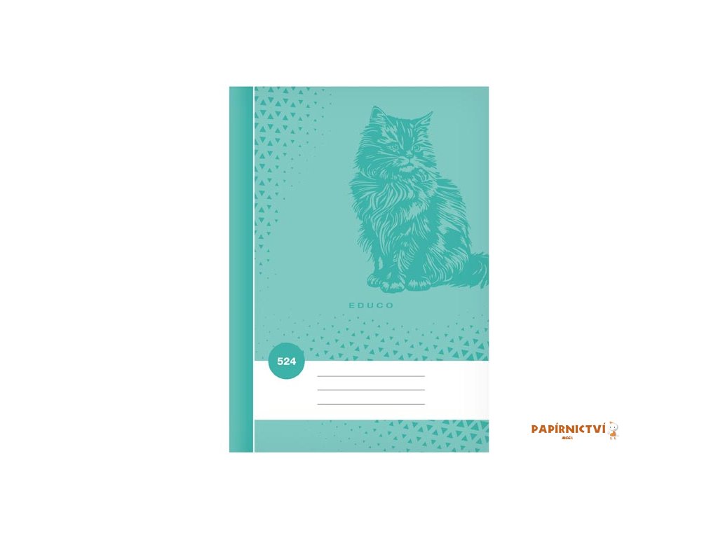 Školní linkovaný sešit ve formátu A5, v zelené barvě, s motivem kočky, v deskách z křídového papíru. Stránky jsou opatřeny okraji o šířce 2 cm.Typ: 524