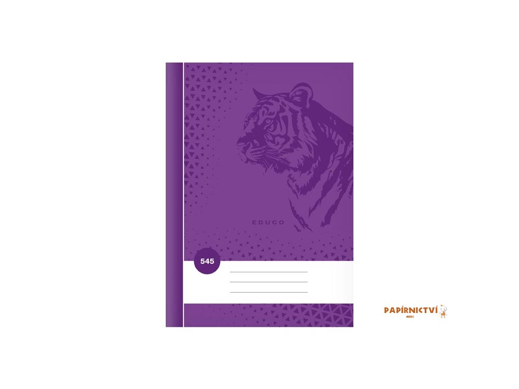 Školní sešit ve formátu A5, čtverečkovaný, v tmavě fialové barvě, s motivem tygra, v deskách z křídového papíru.Typ: 545