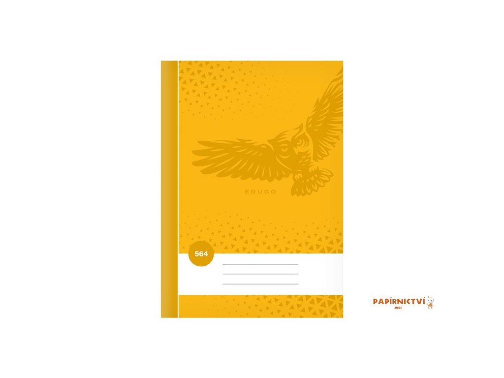 Školní linkovaný sešit ve formátu A5, ve žluté barvě, s motivem sovy, v deskách z křídového papíru. Stránky jsou opatřeny okraji o šířce 1,5 cm.Typ: 564