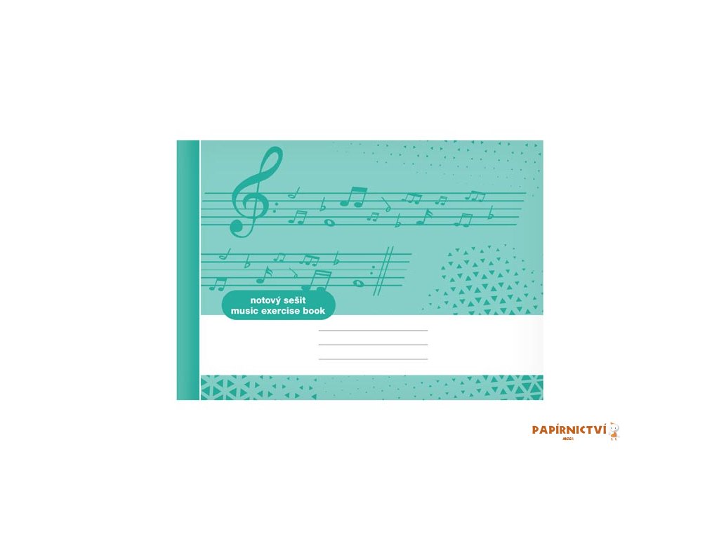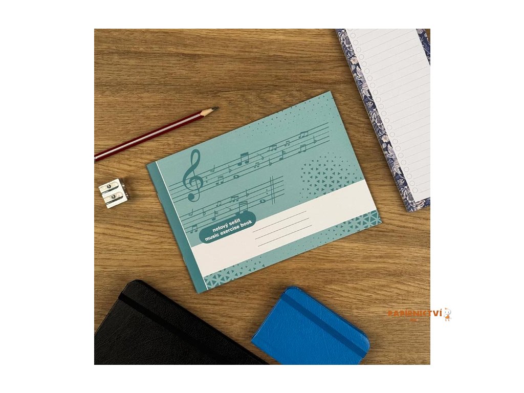 Sešit obsahuje 16 listů s přehledně vyznačenou notovou osnovou, ve které má každá nota své místo. Ležatý formát A5 zajišťuje pohodlné psaní a skvěle sedí na lavici i na notový stojan. Obálka v jemné tyrkysové barvě s hudebním motivem působí svěže a inspirativně.