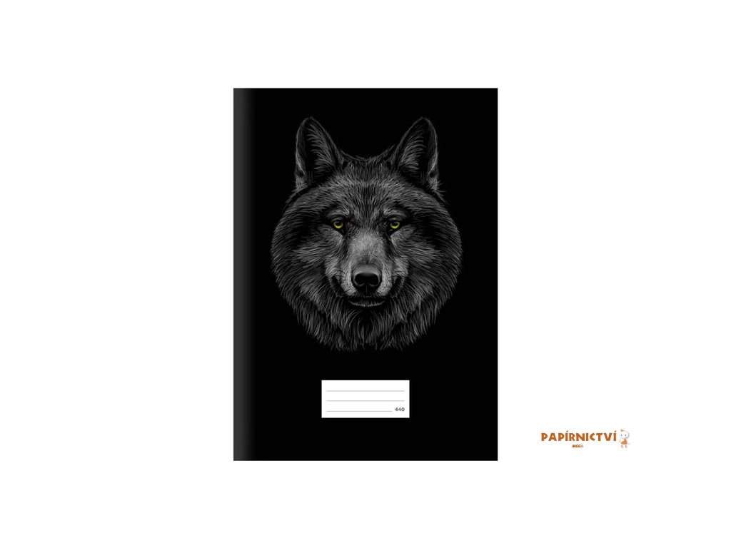 Školní sešit bez linek ve formátu A4, v černé barvě, s motivem vlka, v originálních deskách s matným laminem a lokálním UV lakem.Typ: 440