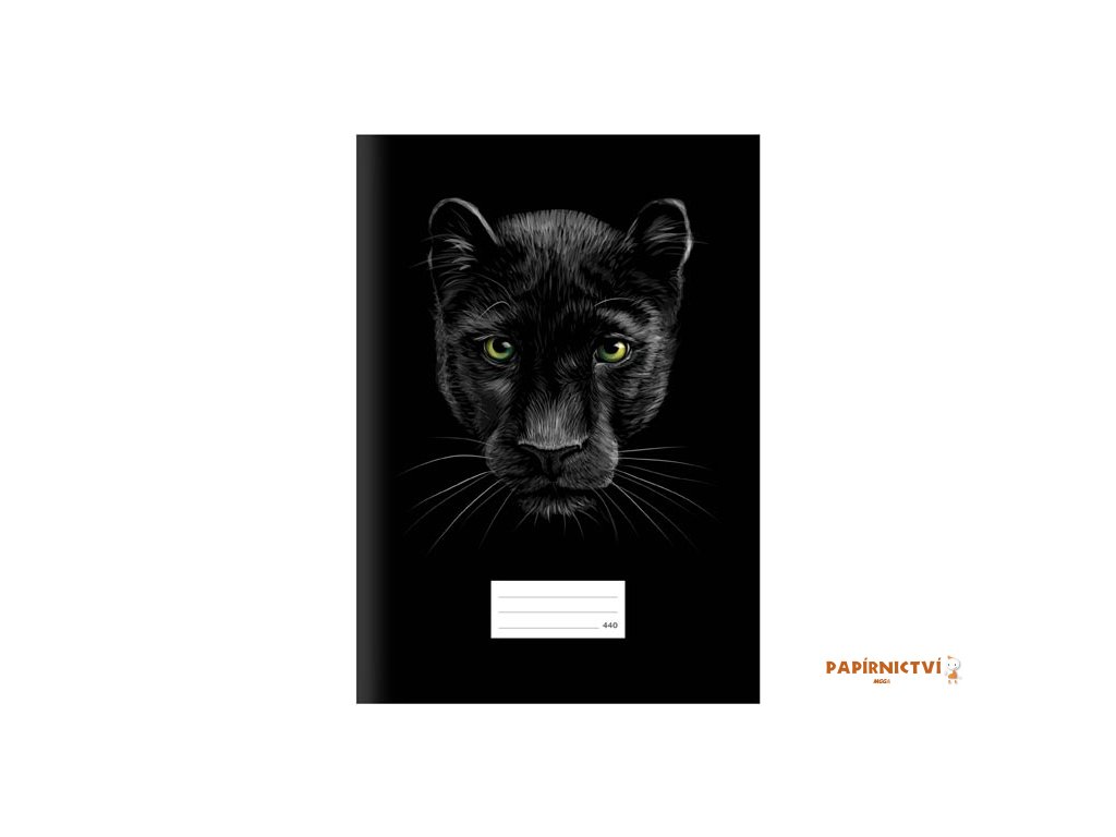 Školní sešit bez linek ve formátu A4, v černé barvě, s motivem černého pantera, v originálních deskách s matným laminem a lokálním UV lakem.Typ: 440