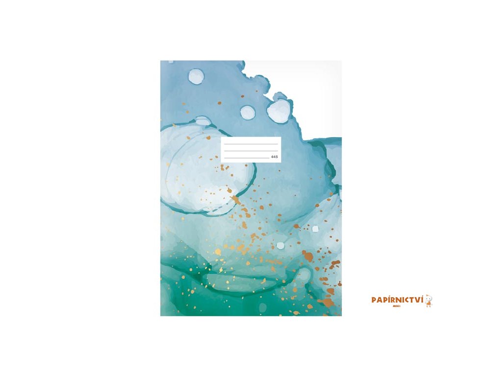 Školní sešit ve formátu A4, čtverečkovaný, v modro-zelené barvě s abstraktním motivem, v originálních deskách s matným laminem a lokálním UV lakem.Typ: 445