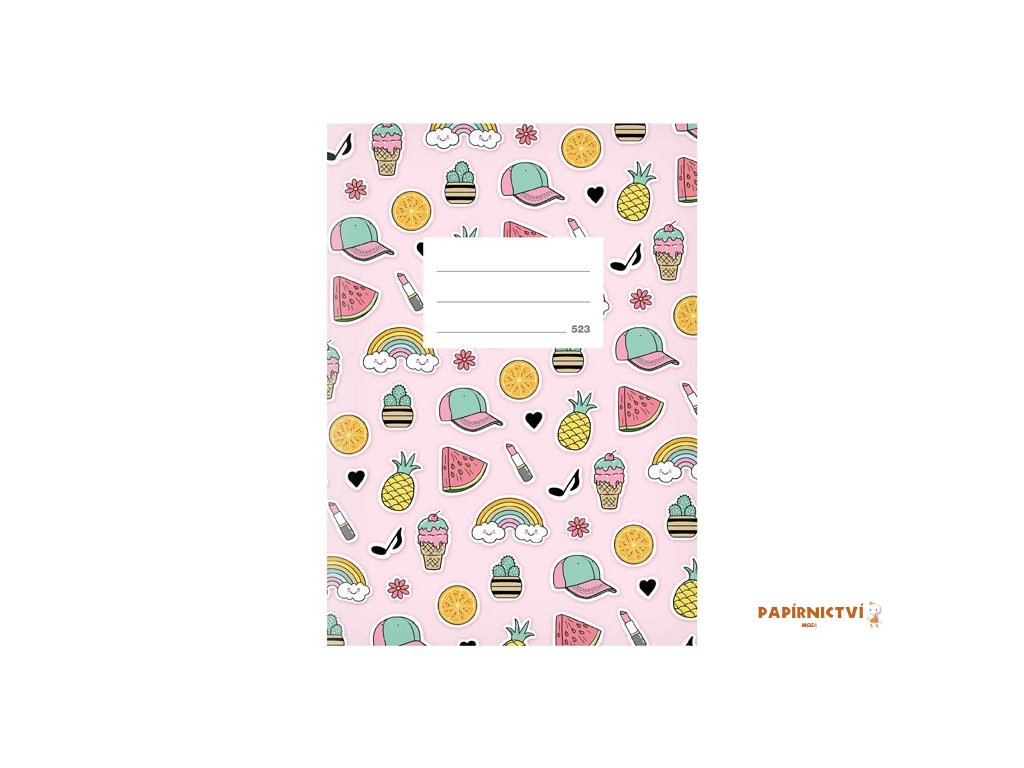 Školní linkovaný sešit ve formátu A5, v růžové barvě, s dívčími motivy, v originálních deskách s matným laminem a lokálním UV lakem. Stránky jsou bez okrajů.Typ: 523