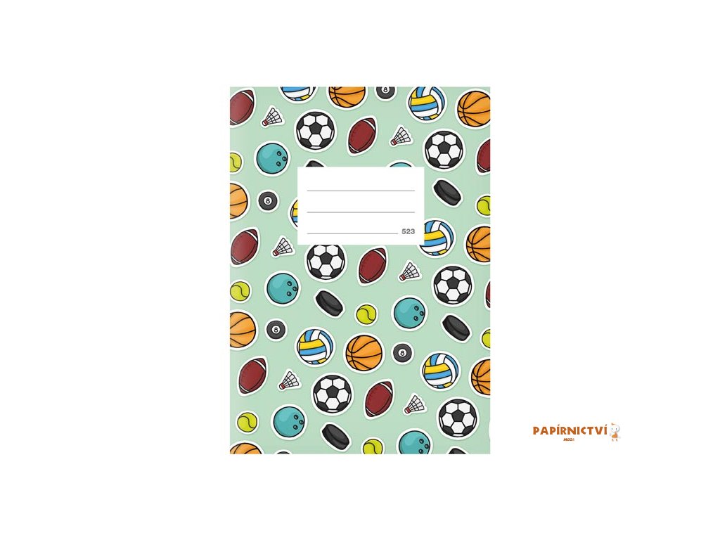 Školní sešit s linkou ve formátu A5, v zelené barvě, se sportovními motivy, v originálních deskách s matným laminem a lokálním UV lakem. Stránky jsou bez okrajů.Typ: 523