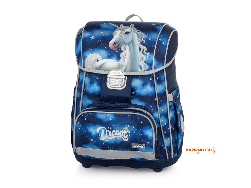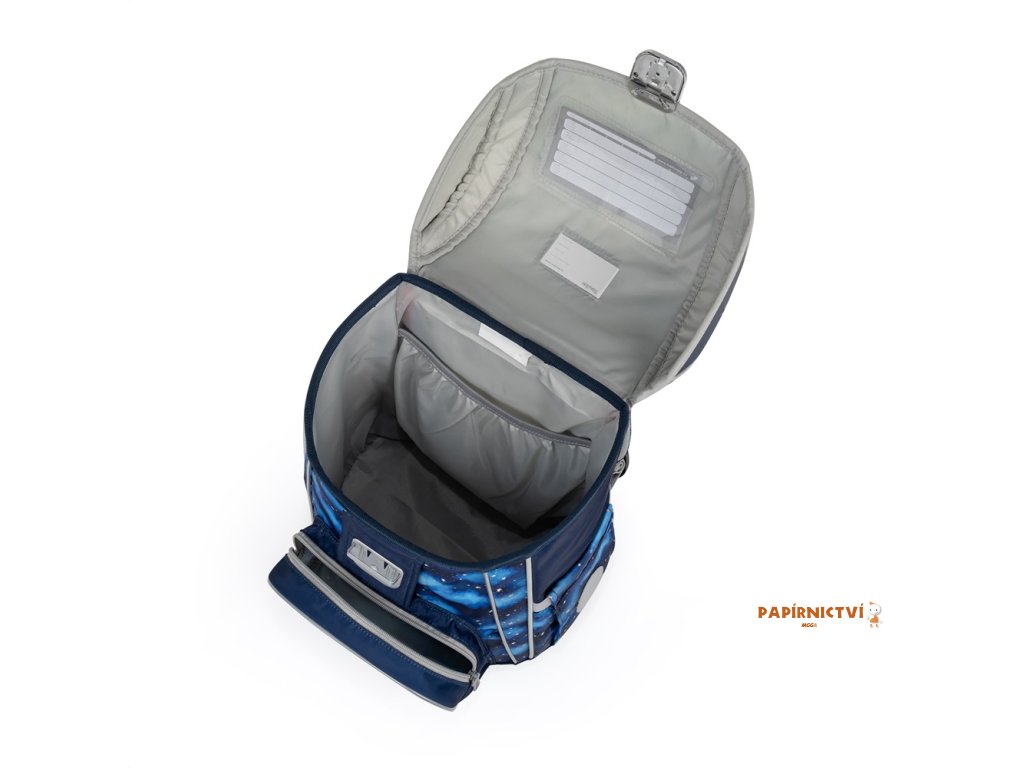 Aktovka: Školní aktovka z řady Premium je anatomicky tvarovaná a zajišťuje tak správné usazení na zádech. Vyztužená záda a vnitřní výztuha udržují stálý tvar batohu. Polstrování je z příjemného prodyšného materiálu, široké měkčené popruhy jsou navrženy tak, aby dokonale přilnuly a rovnoměrně zatížily ramena dítěte. Aktovka se skládá z jedné prostorné komory, kam se pohodlně vejdou všechny školní pomůcky pro děti v 1. a ve 2. třídě. Dno batohu je z pevného materiálu, chrání tím obsah před převržením a vysypáním. Zapínání je na bezpečnostní kovovou přezku s reflexní odrazkou. Přední kapsička je určena na svačinu, nechybí řada reflexních prvků, díky kterým je aktovka viditelnější. Délka zádového panelu: 33 cm. Objem: 27 l. Nosnost: 8 kg. Sáček: Praktický sáček na cvičky nebo přezůvky do školy. Uzavírá se snadno stažením šňůrek. Penál: Jednopatrový školní penál se dvěma chlopněmi bez náplně. Gumová poutka k uchycení psacích potřeb. Na vnitřní chlopni je průhledná fólie na rozvrh hodin.