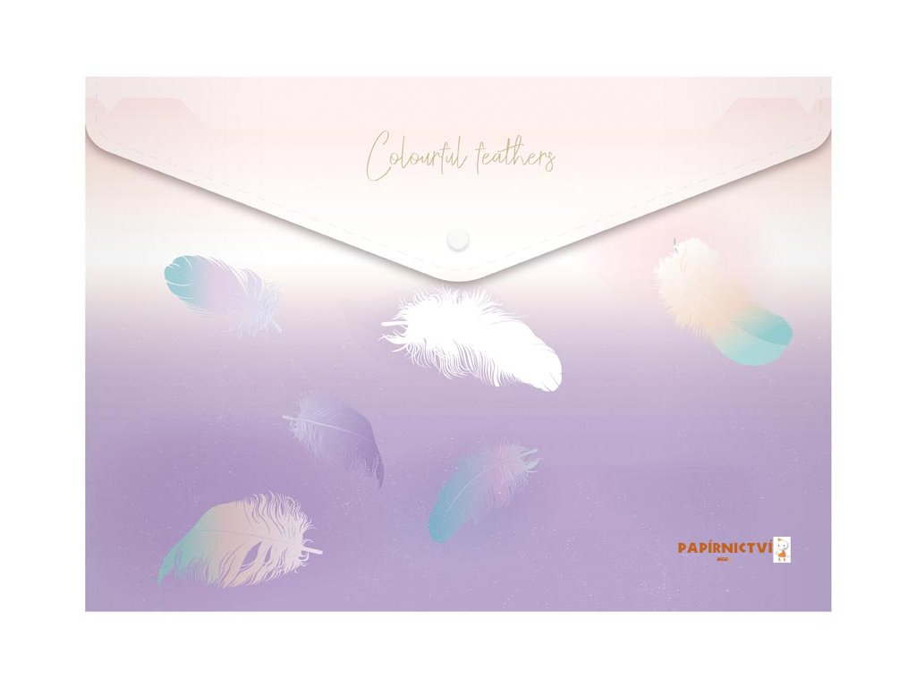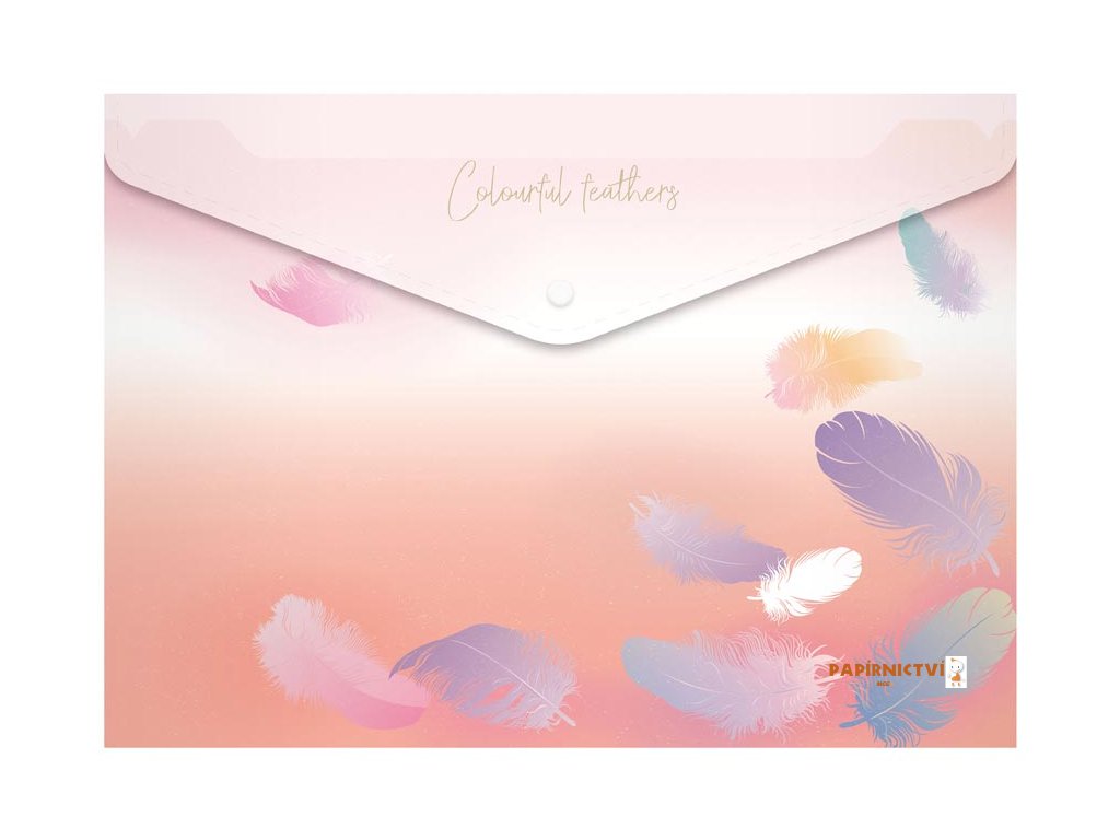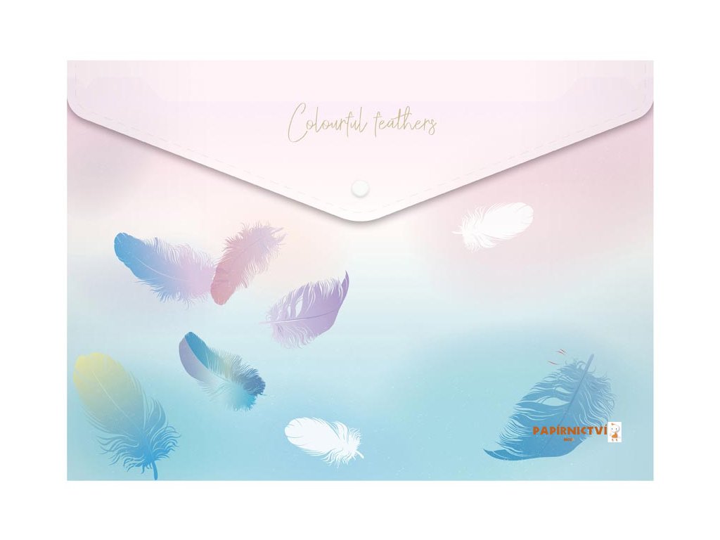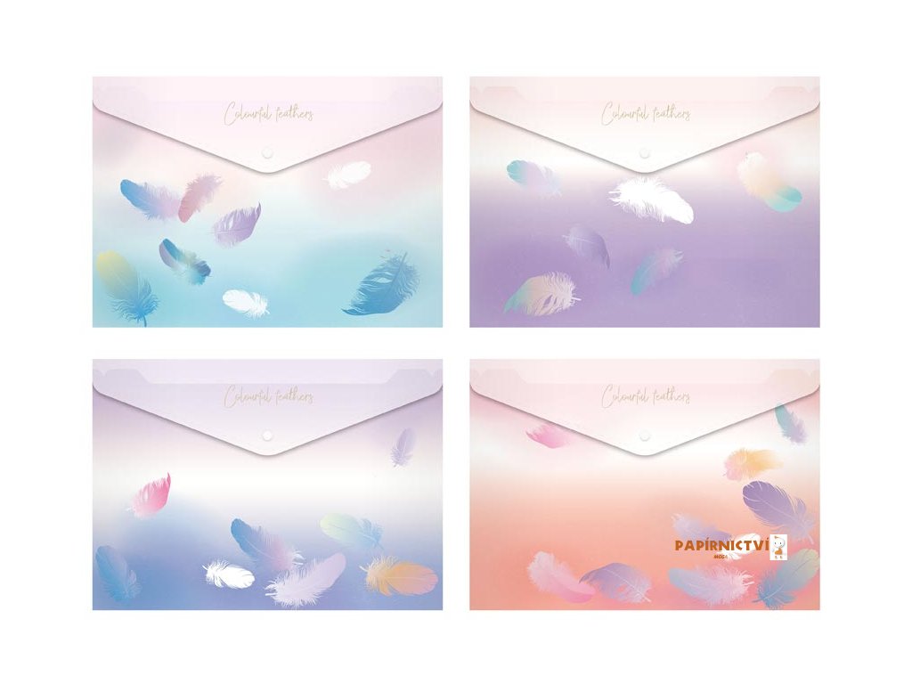 Složka A5 z PolyPropylenu (PP), která se zavírá pomocí druku, s uvolněným motivem pírek, v mixu barev. Složka slouží jako pomocník pro třídění a ukládání dokumentů, takže je budete mít vždy pohromadě.POTISK: pírka