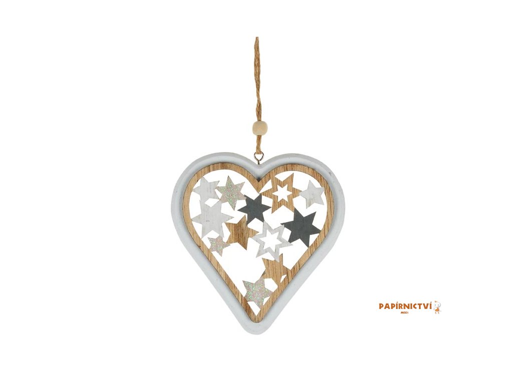 Stylová dřevěná vánoční dekorace ve tvaru srdce se závěsem. Srdce je vyplněno malými hvězdičkami. Velikost 11cm.Doplňkové parametry