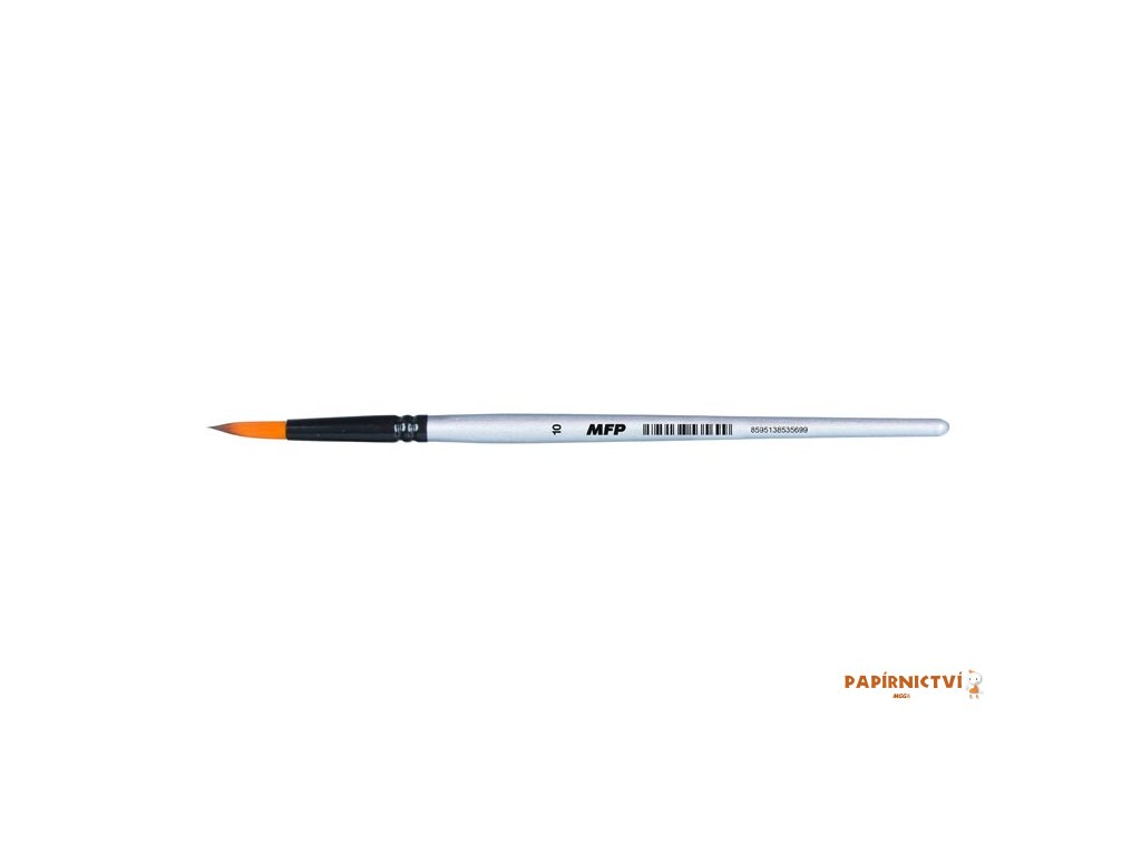 Štětec kulatý s jemným syntetickým vlasem tvarovaným do špičky a dřevěnou rukojetí. Díky syntetickým vláknům usnadňuje roztírání barev a dobře drží tvar. Vlákno je elastické a vyniká vysokými absorpčními schopnostmi. Je méně náchylný k poškození barvami a ředidly než štětec přírodní. Je také výrazně odolnjěší proti poškození či lámaní. Snadno se udržuje v čistotě, a proto vykazuje delší životnost. Hodí se jak pro školní využití, tak i pro různé malířské techniky a povrchy. Ideální pro malování detailů, linek nebo vybarvování. Štětiny jsou chráněny plastovou krytkou.Velikost: 10