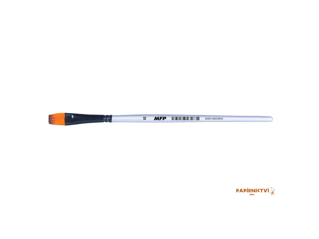 Štětec plochý s jemným syntetickým vlasem a dřevěnou rukojetí. Díky syntetickým vláknům usnadňuje roztírání barev. Vlákno je elastické a vyniká vysokými absorpčními schopnostmi. Je méně náchylný k poškození barvami a ředidly než štětec přírodní. Je také výrazně odolnjěší proti poškození či lámaní. Snadno se udržuje v čistotě, a proto vykazuje delší životnost. Hodí se jak pro školní využití, tak i pro různé malířské techniky a povrchy. Ideální pro malování větších ploch nebo stínování. Lze s ním malovat na plocho nebo hranou tenké linky. Určený pro hutnější barvy, kde je důležitá pevnost a odolnost.Velikost: 12