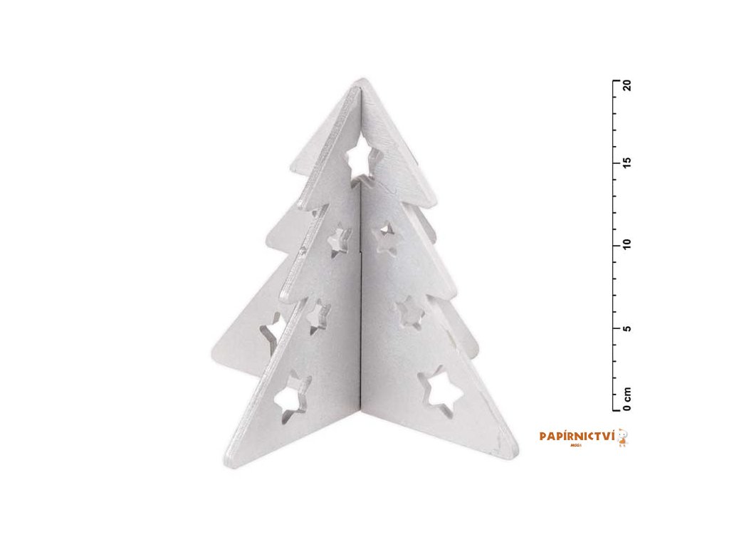 Vánoční dřevěná dekorace, skládací stromeček stříbrné barvy. Ve stromečku jsou vyřezané hvězdy. Tato vánoční ozdoba se skládá ze dvou dílů, které se jednoduše zasunou do sebe.Výška stromečku: 20 cm