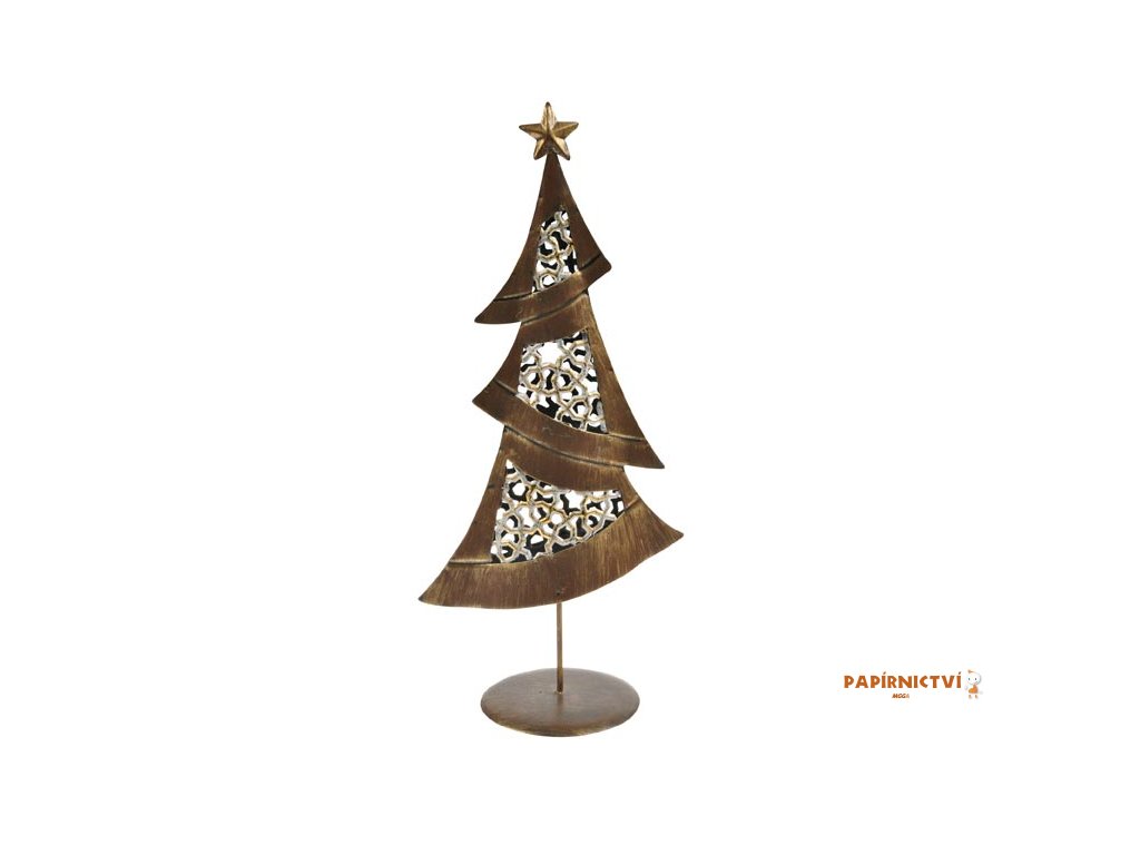 Stromek plechový zlatý s 3D efektem. Vánoční stromek je vyřezávaný a má podstavec. Lze umístit na jakoukoliv plochu ke zkrášlení místnosti.Barva: zlatá