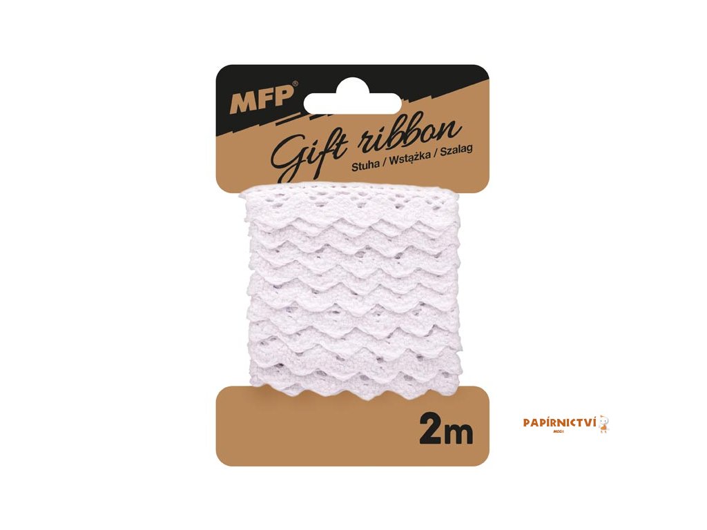 Krajková, bavlněná stuha v bílé barvě. Vhodná pro svatební dekorace, ruční šití, zdobení oděvů, k zabalení dárku nebo zavázání květin. Krajková stuha je opakovatelně použitelná.Délka: 2 m