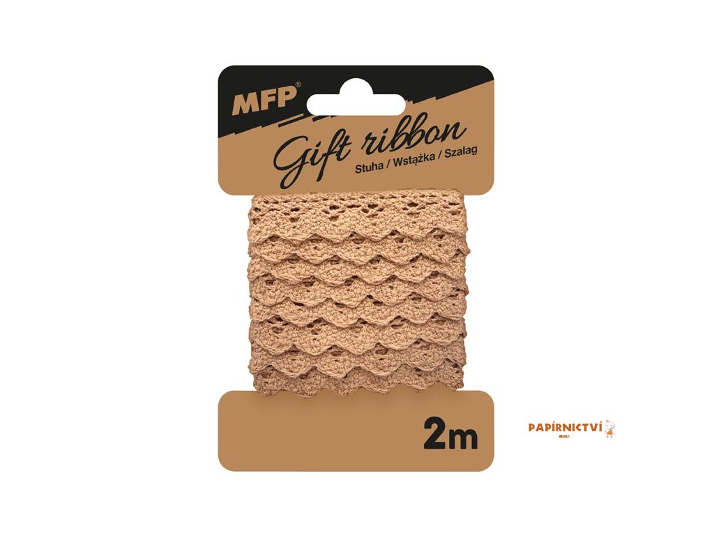 Krajková, bavlněná stuha v hnědé barvě. Vhodná pro svatební dekorace, ruční šití, zdobení oděvů, k zabalení dárku nebo zavázání květin. Krajková stuha je opakovatelně použitelná.Délka: 2 m