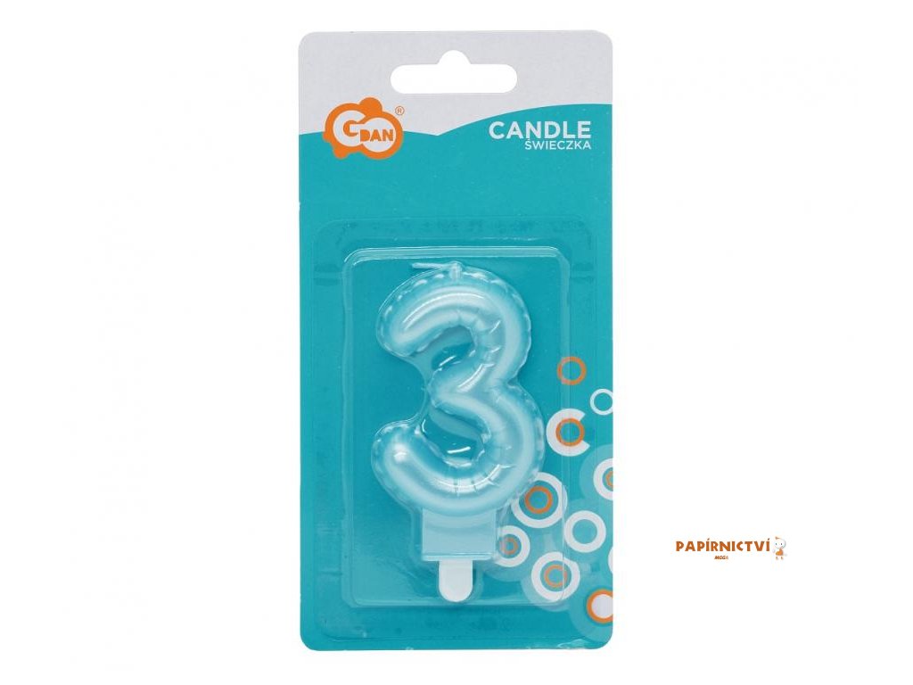 Číslice 3 svíčka na podstavci, světle modrá, perleťová